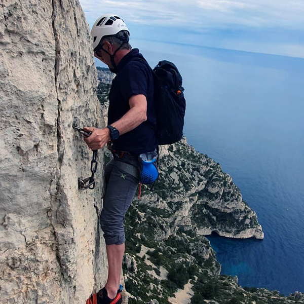 Toujours avec nos fidèles guides de la Compagnie des guides de Chamonix, nous sommes allé tester la résistance aux chocs de la montre dans les somptueuses Calanques de Marseille. C'est entre autres, à la Grande Candelle, dans l'arête de Marseille que nous avons pu escalader le magnifique calcaire avec un mémorable passage du fameux pas Rébuffat.